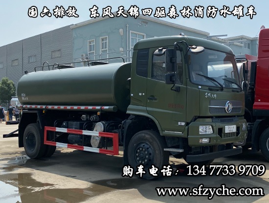 東風(fēng)天錦四驅(qū)森林消防灑水車_國(guó)六排放潤(rùn)知星牌SCS5164GPSDFV6型四驅(qū)越野綠化噴灑車采用DFV2163GP6DJ型國(guó)六排放東風(fēng)天錦四驅(qū)越野底盤,東風(fēng)天錦D530一排半駕駛室,4×4驅(qū)動(dòng),康明斯B6.2NS6B210國(guó)六發(fā)動(dòng)機(jī)210馬力,最大扭矩850N.m/1100-1700rpm,排量6.2L、韶齒手動(dòng)六檔變速箱,東風(fēng)德納車橋,前驅(qū)動(dòng)橋4.5噸,后橋10噸,10.00R20輪胎,軸距4500mm/4700mm,電動(dòng)玻璃,方向助力,斷氣剎,ABS,大燈自動(dòng)調(diào)節(jié),自動(dòng)調(diào)整臂,選裝原廠空調(diào)。罐體采用優(yōu)質(zhì)碳鋼Q235板材,板材厚度4mm,罐體容積8.7立方,安裝夾心取力器,后置泵箱,消防栓接口左右各一個(gè),消防炮采用PS30-50D消防水炮,流量40L/S/1.0MPa 水射程:≥50m,消防泵采用常壓消防泵型號(hào):CB10/40車用消防泵,流量:40L/s,壓力:1.0MPa,駕駛室頂部安裝長(zhǎng)條警燈帶喊話器,兩側(cè)噴涂白色森林消防字樣。