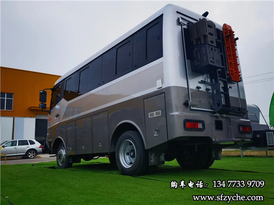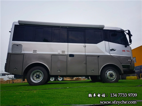 車身右側(cè)配備了4m的電動(dòng)遮陽棚、市電接口、尾部工具箱、戶外照明燈,中置上客門,副駕駛乘客門,車輛門鎖均采用越野專用倉(cāng)門鎖。