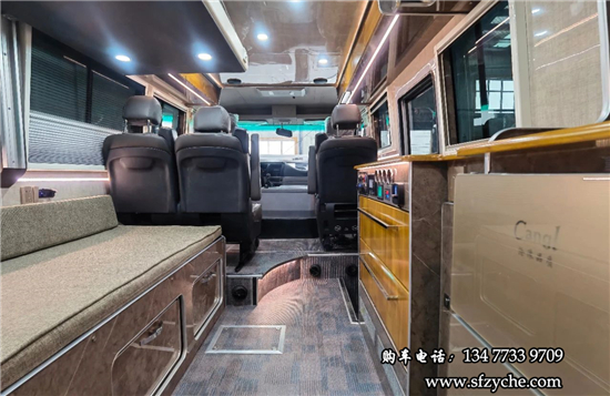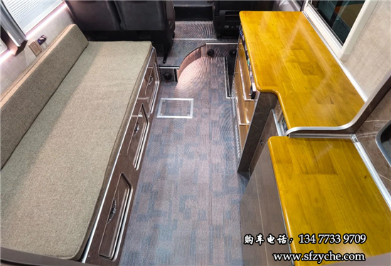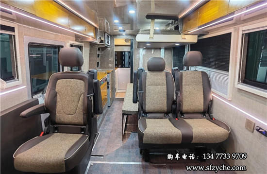 得益于方正的車身,車內(nèi)空間非常寬敞,內(nèi)寬可達(dá)2米。布局方面從前往后依次是駕駛區(qū)、乘坐區(qū)、生活區(qū)和尾部的廚衛(wèi)區(qū)域。整車核載5人,車廂中部采用2+1座椅布局,全部帶有扶手和頭枕,乘客座椅全部朝前設(shè)計(jì),增加了乘坐的舒適度。