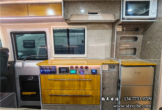 單人座椅后方是中置上客門,在后方是一體式櫥柜,下方帶有儲(chǔ)物抽屜,上方暗藏了一臺(tái)家用變頻空調(diào),乘客門上方也提供了多個(gè)儲(chǔ)物吊柜,儲(chǔ)物空間充足。櫥柜旁鑲嵌了一臺(tái)108L上下雙開門的冰箱,上方則是一臺(tái)微波爐,側(cè)面的壁板上還帶有電源插座。