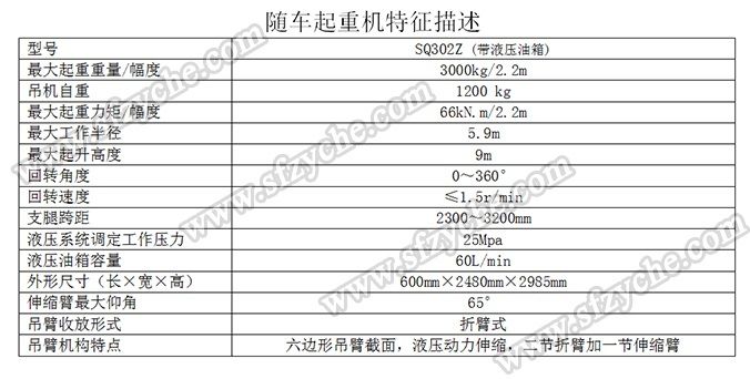 凈功率206kw; 起重機型號為:SQ302Z(帶液壓油箱),起重機質量為:1200kg,最大額定超升載荷為:3000kg. 側防護金屬材料Q235斷面槽形,螺栓連接,斷面高度40mm,離地高度450mm; 后防護金屬材料Q235斷面槽形,螺栓連接,斷面高度135mm,離地高度500mm; 安裝具有衛(wèi)星定位功能行駛記錄儀,東風越野隨車吊:m.2vwl53.com 吊機詳細參數(shù):