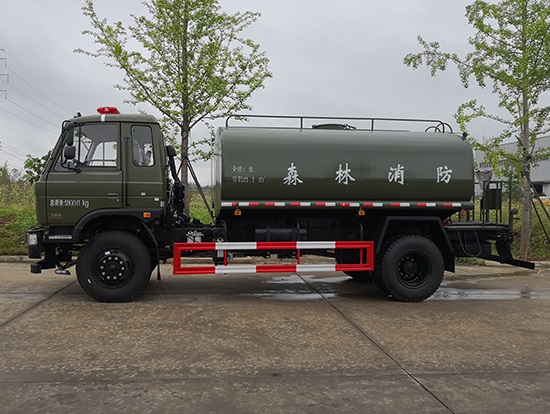 采用東風(fēng)EQ2180GD5DJ型越野汽車底盤,東風(fēng)一排半寬體駕駛室,4×4驅(qū)動(dòng),康明斯ISB190 50國五發(fā)動(dòng)機(jī),六檔變速箱,東風(fēng)商用車橋,前驅(qū)動(dòng)橋3.8噸,后橋10噸,10.00R20輪胎,軸距4500mm,電動(dòng)玻璃,方向助力,斷氣剎,ABS。罐體采用優(yōu)質(zhì)碳鋼QB235板材,板材厚度4mm,罐體容積11.1立方,變速箱安裝取力器,大功率水泵可泵進(jìn)泵出,后置工作平臺(tái)帶水炮射程25米,消防栓接口左右各一個(gè),選裝駕駛室頂部安裝長條警燈帶喊話器,全車顏色軍綠,兩側(cè)噴涂白色森林消防字樣。