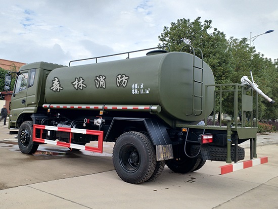 采用東風(fēng)EQ2180GD5DJ型越野汽車(chē)底盤(pán),東風(fēng)一排半寬體駕駛室,4×4驅(qū)動(dòng),康明斯ISB190 50國(guó)五發(fā)動(dòng)機(jī),六檔變速箱,東風(fēng)商用車(chē)橋,前驅(qū)動(dòng)橋3.8噸,后橋10噸,10.00R20輪胎,軸距4500mm,電動(dòng)玻璃,方向助力,斷氣剎,ABS。罐體采用優(yōu)質(zhì)碳鋼QB235板材,板材厚度4mm,罐體容積11.1立方,變速箱安裝取力器,大功率水泵可泵進(jìn)泵出,后置工作平臺(tái)帶水炮射程25米,消防栓接口左右各一個(gè),選裝駕駛室頂部安裝長(zhǎng)條警燈帶喊話(huà)器,全車(chē)顏色軍綠,兩側(cè)噴涂白色森林消防字樣。