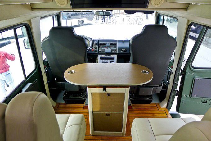 越野房車內(nèi)飾:可以看到,柚木地板外加兩個(gè)電動(dòng)座椅與一個(gè)帶儲(chǔ)藏柜的可移動(dòng)多功能桌構(gòu)成了這輛越野房車的第二排。除此之外,頭頂上方安置有26寸索尼液晶電視和帶衛(wèi)星電視機(jī)頂盒的藍(lán)光播放器,微波爐烤箱、小型冰箱、電磁爐等常用設(shè)備也是一應(yīng)俱全,當(dāng)然恒溫式的出水系統(tǒng)以及真空馬桶、獨(dú)立淋浴也是一樣不少。具備天窗和側(cè)窗的尾箱處安置有兩張舒適的標(biāo)準(zhǔn)床鋪,可以說(shuō)盡管這輛U5000并非加長(zhǎng)特裝版,但所有居住設(shè)備都很齊全。
