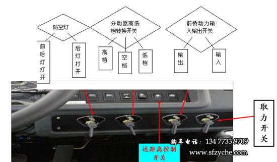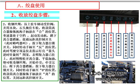 2、收鋼絲繩:拉上駐車制動(dòng)受控閥,并用木塊,石頭掩住車輪,將鼓筒離合器操縱機(jī)構(gòu)手柄放在“合”的位置,變速器處于空檔 ,起動(dòng)發(fā)動(dòng)機(jī),踏下離合器踏板,接通遠(yuǎn)距離控制開關(guān)(此時(shí)蜂鳴器叫),按下取力器自鎖開關(guān),同時(shí)轉(zhuǎn)動(dòng)手柄至“反”的位置,此時(shí)駕駛室頂蓋儀表指示燈亮“箭頭逆時(shí)針旋轉(zhuǎn)”圖案,表明取力器已掛上,此時(shí)慢慢松開離合器,平穩(wěn)加油,即可收卷鋼絲繩,開始牽引。牽引完后,踩下離合器踏板,按下取力器自鎖開關(guān),同時(shí)轉(zhuǎn)動(dòng)手柄至“0”的位置,將鼓筒離合器操縱手柄放在“離”的位置,關(guān)閉遠(yuǎn)距離控制開關(guān)。