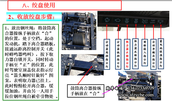 1、放出鋼絲繩:將鼓筒離合器操縱手柄放在“合”的位置,變速器處于空檔,起動(dòng)發(fā)動(dòng)機(jī),踏下離合器踏板,接通遠(yuǎn)距離控制開關(guān)(此時(shí)蜂鳴器鳴叫),按下取力器自鎖開關(guān),同時(shí)轉(zhuǎn)動(dòng)手柄至“正”的位置,此時(shí)駕駛室頂蓋儀表指示燈亮“箭頭順時(shí)針旋轉(zhuǎn)”圖案,表明取力器已掛上,此時(shí)慢慢松開離合器,緩緩加油,并由另一人用手拉住鋼絲繩自被牽引物處 。
