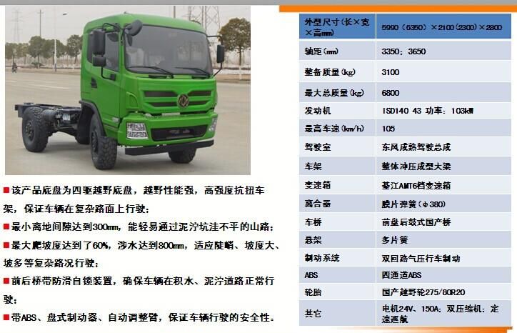 相關(guān)車(chē)型EQ2070GZ4DJ越野四驅(qū)底盤(pán)的詳細(xì)描述:該產(chǎn)品底盤(pán)為四驅(qū)越野底盤(pán),越野性能強(qiáng),高強(qiáng)度抗扭車(chē)架,保證車(chē)輛在復(fù)雜路面上行駛時(shí),不會(huì)出現(xiàn)大梁斷裂等情況;最小離地間隙達(dá)到300mm,能輕易通過(guò)泥濘坑洼不平的山路;最大爬坡度達(dá)到了60%,適應(yīng)陡峭、坡度大、坡多等復(fù)雜路況行駛。前后橋帶防滑自鎖裝置,確保車(chē)輛在積水、泥濘道路正常行駛;帶ABS、盤(pán)式制動(dòng)器、自動(dòng)調(diào)整臂,保證車(chē)輛行駛的安全性。