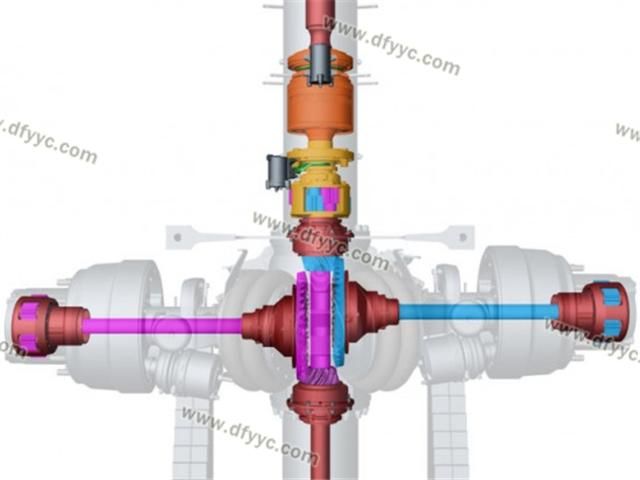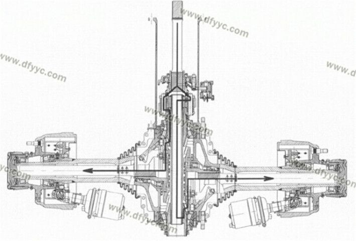 另外,這種斷開式車橋的輪間差速器并不在橋包中,而是被轉(zhuǎn)移到了脊柱套管了,左右側(cè)車輪分別由兩套錐齒輪驅(qū)動,為了讓這兩套錐齒輪互不干涉,其左右半軸在縱向錯開了一定的距離,也就是說它的兩個半軸并不在一個平面內(nèi)。類似的設計手法裝載機(4X4軸轉(zhuǎn)向的裝載機)上也有使用,還有采用錯開一定角度的做法來避免左右錐齒輪互相干涉的情況。